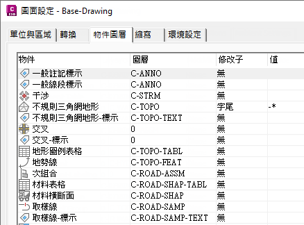 為了使處理更快,請凍結或關閉包括物件的圖面圖層。依預設,設計物件及其標示被劃分在多個圖層中。例如,定線、縱斷面以及其他道路設計物件分散在均以 C-ROAD 開頭的多個圖層中,如圖 5 所示。如果將道路設計物件合併至較少的圖層上,則打開或關閉它們將更加容易。