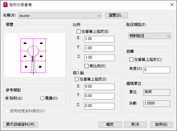 - 在「外部參考」對話方塊中,將「插入點」設定為 0,0,0,將「比例」設定為 1,1,1,將「旋轉角度」設定為 0。