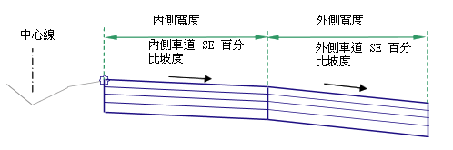 此次組合可建立一組可具有不同坡度的內側車道和外側車道。使用內側車道超高坡度從貼附點向外插入內側車道。如果在某樁號處未定義超高,則使用「內側預設百分比坡度」值。使用外側車道超高坡度或「外側預設百分比坡度」從內側車道的端點向外插入外側車道。
