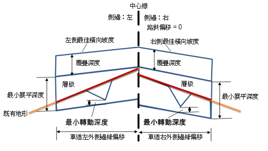 | 左側既有地面坡度 | 計算從左側車道內側邊緣到左側車道外側邊緣而得的左側車道既有地形縱斷面橫向坡度 (%)。 | 負數 | n/a |