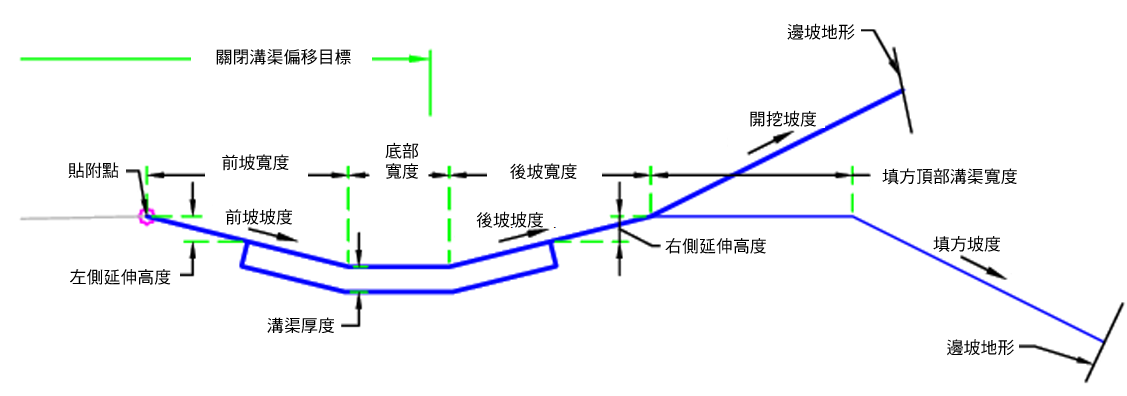 如果參數需要溝渠,則會使用輸入參數建置溝渠。如果找到「省略溝渠」目標,則不會建置溝渠。如果溝渠厚度大於 0,則會建置溝渠襯砌。如果溝渠在填方中,則會套用填方頂部溝渠寬度。
