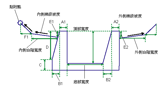 此次組合可建置溝渠結構的造型,如圖中所示。若要省略台階式和前坡連接,請為相應的寬度參數輸入零。