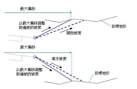 此次組合嘗試計算挖方情況的邊坡點。如果找到邊坡點,則會將其偏移與「最大偏移」值進行比較。如果超過「最大偏移」值,則會將邊坡點移至目標地形上的最大偏移點處。如果未找到任何挖方邊坡點,則會為填方條件重複此過程。