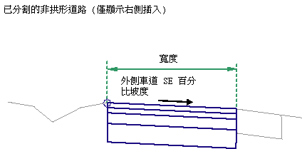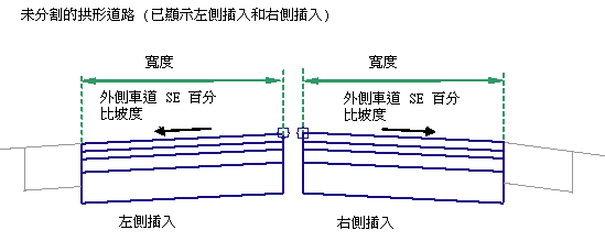 此次組合可透過套用外側車道超高坡度值來插入行巷道,並可加寬超高區域處的鋪面。
