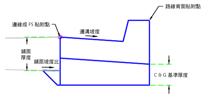 在貼附點設定初始點。根據選取的「路緣類型」,建立路緣與邊溝的點、連接和造型。再將基層置於路緣與邊溝下方。