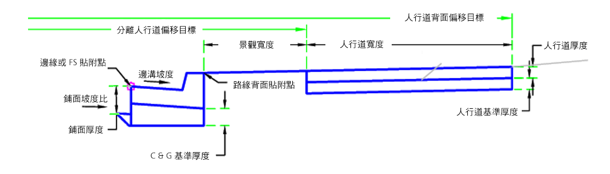 | 分離式人行道偏移 | 可用於取代固定的人行道寬度,並將人行道內側邊緣連接到偏移定線。以下物件類型可以用作指定寬度的目標:定線、聚合線、地勢線或測量圖形。 | 可選 |