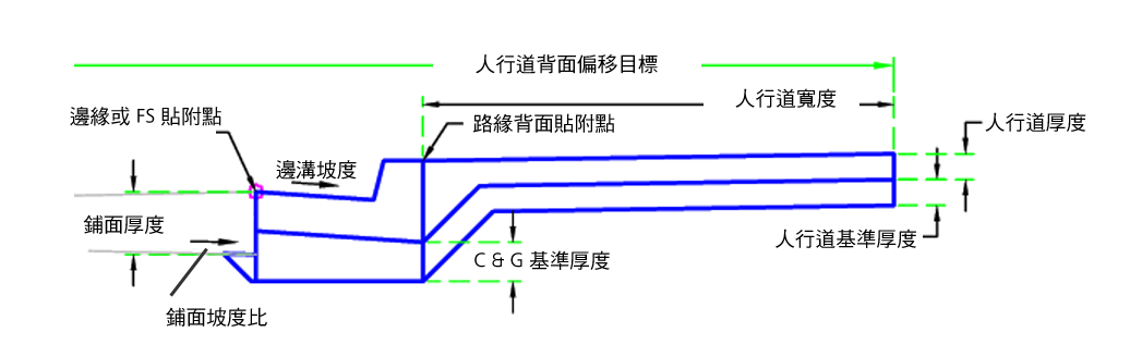 | 人行道背面偏移 | 可用於取代固定的人行道寬度,並將人行道外側邊緣連接到偏移定線。以下物件類型可以用作指定寬度的目標:定線、聚合線、地勢線或測量圖形。 | 可選 |