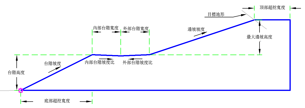 在找到目標地形後,過度挖掘寬度將套用於頂部,在此頂部邊坡連接與目標地形相交。如果插入點和目標地形之間的垂直距離小於最大邊坡高度,則不會放置台階和邊坡連接。
