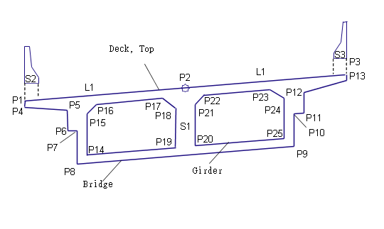 貼附點位於橋面完工整地地形上左右車道之間的分割線上。橋樑橫斷面建置在左右兩側。