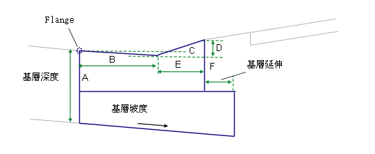 將根據輸入參數標註 (標註 A – 標註 F) 插入路緣和邊溝連接。所有標註都必須為非零的正值。如果指定非零的基層深度,則會將基層圖層插入到路緣背面,並繼續延伸「基層延伸」的寬度。基層圖層接近於路緣背面的底部,如圖中所示。