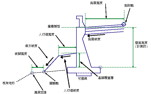 | 填方坡度 | 從人行道到關聯點的填方連接的坡度 (坡度類型) | 數字 | 2.00 : 1 |