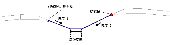 貼附點和已標記點的位置已確定。已標記點可以位於貼附點的右側,也可以位於貼附點的左側。這些連接從附貼點以坡度 1 向內延伸,並從已標記點以坡度 2 向內延伸,直到它們相交。如果指定了非零的溝渠寬度,則會將水平溝渠底部連接填入相交側坡。