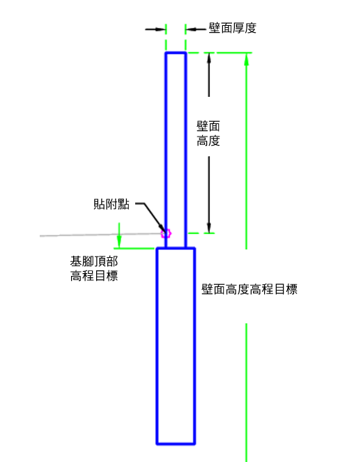 | 壁面高度 | 可以用於取代壁面高度,並將牆頂部高程連接至縱斷面高程。以下物件類型可以用作指定高程的目標:縱斷面、3D 聚合線、地勢線或測量圖形。 | 可選 |