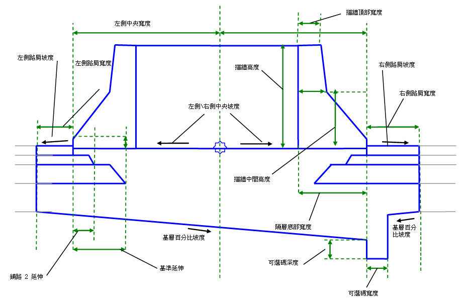 | 右側鋪路 2 延伸 | 鋪路 2 圖層超出右側鋪路路肩邊緣並延伸到中央的寬度。即使右側路肩寬度設定為零,仍提供此參數 | 正數 |