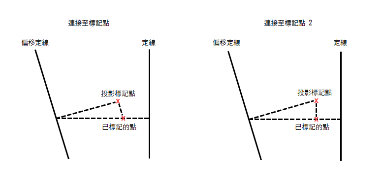 與連結相比,當已標記的點位於偏移組合基準線時,連接至標記點 2 次組合和連接至標記點次組合之間的主要差異在於其應用。下圖展示了兩個次組合之間的差異。