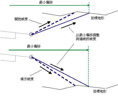 此次組合可插入以使用者定義的開挖坡度或填方坡度建立邊坡至目標地形的連接。