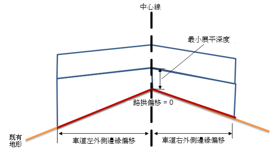 選取即會將覆疊的內側邊緣連接至縱斷面,或調整路拱點高程至最小展平深度