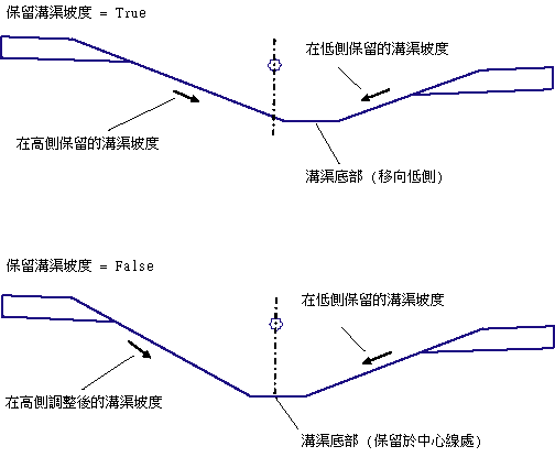 超高或轉彎車道可能會導致左側和右側的溝渠坡度頂部位於不同的高程處,從而產生不對稱的溝渠。處理此種情況,有兩個選擇。如果「保留溝渠坡度」設定為 True,則兩側都會保持指定的溝渠坡度不變,這樣會將溝渠底部從中心線向較低的一側移動。如果設定為 False,則會以中央中心線做為溝渠底部的中心,在較低一側上保留指定的坡度,並調整較高一側上的坡度,以便相符。