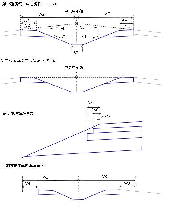 | 路肩坡度方向 | 指定將路肩坡度方向設為遠離路拱或向路拱 |