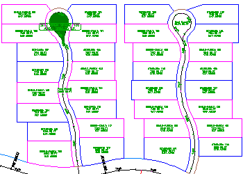 此圖面包含東西向主要道路的五條分支道路。兩條北側支線道具有中心線定線,每條中心線定線已在道路和囊底路中央交通島中建立了宗地。在接下來的幾個步驟中,您會將其中一條南支線道路的中心線轉換為定線,並防止它形成宗地。