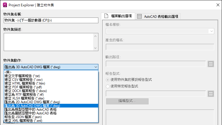 - 在「建立物件集」對話方塊的「物件集動作」下拉式清單中,加入「建立 XML 檔案報告」。