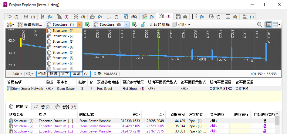 - 改進了功能,在「管網」頁籤中為縱斷面視圖選取起點和終點結構時,可輕鬆捲動較長的結構清單。
