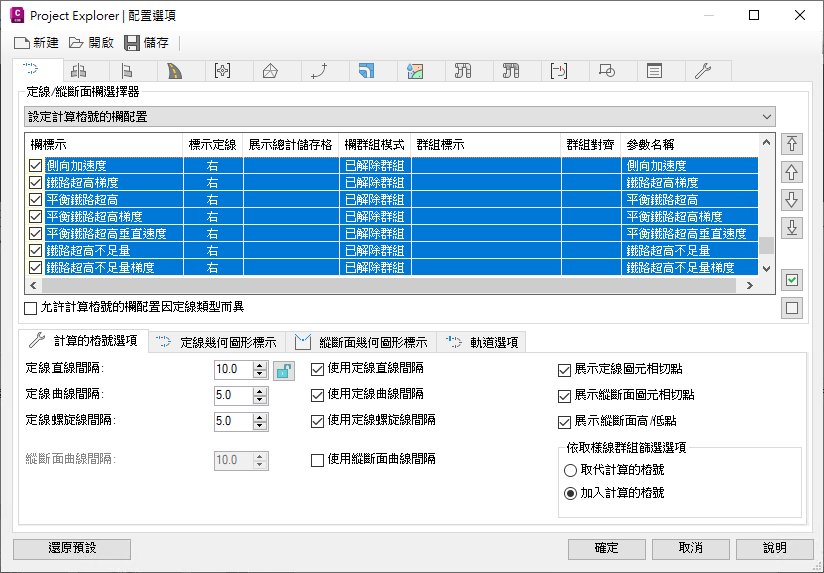 - 以下軌道鐵路超高值已加入至計算的樁號清單,並且可在報告和表格中使用。