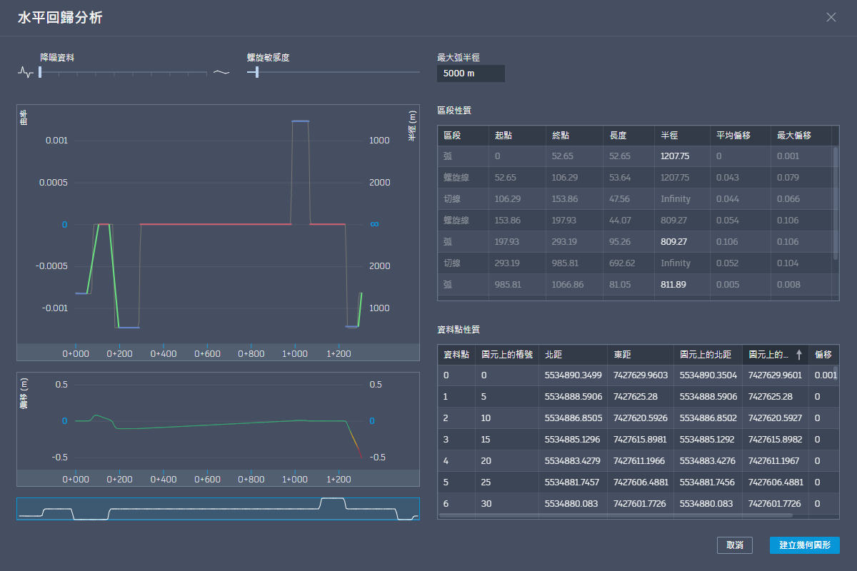 水平回歸分析是一種功能強大的技術,用於根據現有路徑的測量資料,為線性基礎設施建立最佳化定線。隨著時間的推移,鐵路軌道或道路等線性設施的幾何形位可能會偏離其原始位置,從而產生影響效能和安全性的缺陷。水平回歸可透過沿目前路徑取得測量點,並計算由切線 (直線)、圓形曲線和變化螺旋線等幾何元素組成的新「最佳擬合」定線,來解決此問題。主要目標是建立平滑、精確的定線,以盡量減少自現有設施位置的偏差 (或偏移)。