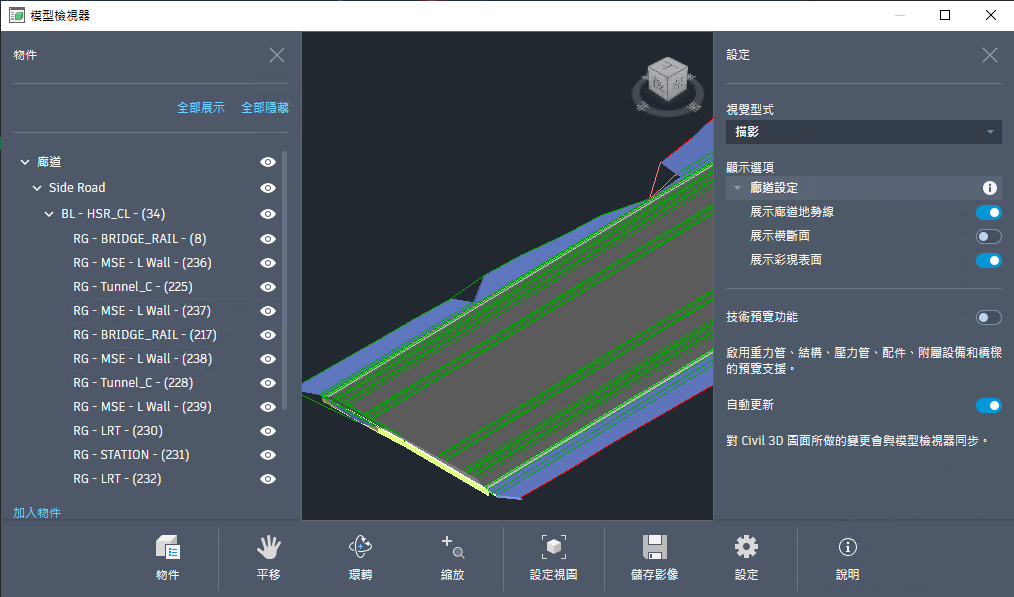 新的模型檢視器有助於對 Civil 3D 環境中選取的物件,進行高效能和單獨的 3D 檢閱。開啟檢視器、選取物件,然後自由導覽圖面的這些元素。