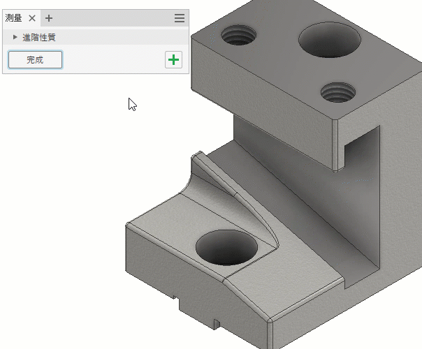依需要在圖形視窗中選取多項,然後按一下「測量」面板中測量類型旁邊的加號,以將值加入至累積群組。這些值顯示在該測量類型特定的累積群組中。例如,半徑會加入至「累積性質」下的「距離」群組,而角度會加入至「角度」群組。