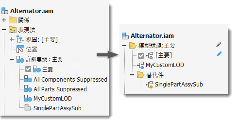 加入了詳細等級表現法,以在電腦速度較慢及記憶體較少時,增大容量和提高效能。在 Inventor 2022 或更高版本中,包含詳細等級和替代件的組合會轉換為模型狀態。
