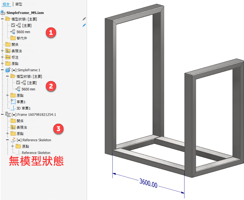 系統產生的框架組合 Frame 160798...(3) 使用名為「參考骨架」的草圖來控制目前的配置。「參考骨架」是 SimpleFrame 中草圖幾何圖形的複本。由於系統產生的框架檔案中不允許模型狀態,因此框架參考骨架草圖永遠會反映在 SimpleFrame:1 的目前作用中模型狀態草圖中指定的標註。