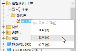在要編輯的替代件上按一下右鍵,然後按一下「啟用」。模型會更新以顯示替代件。