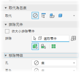 排除元件 - 提供一些選項,用於選取要包括在簡化零件中或從其中排除的元件。選取個別元件或元件的所有複本。