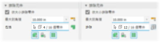 依選取排除零件 (預設)。「依大小排除零件」已除選,且「排除」選取器處於作用中。