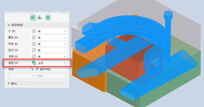 「移除特徵」提供一些選項,可讓您依類型和大小選取特徵,以包括在簡化零件中或從中排除。特徵清單包括孔、圓角、倒角、型腔 (差集)、浮雕 (聯集) 和通道 (單一項目和多重項目)。內部空心會自動移除。
