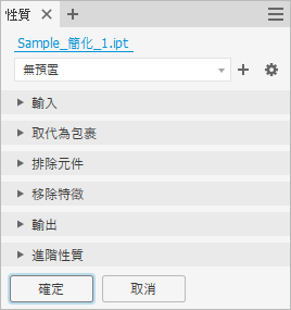 「性質」面板是由控制、輸入欄位和選取器組成的群組,用於減少簡化模型中的元件和特徵數量。您在「性質」面板中逐步指定選項時,會顯示對應的群組。