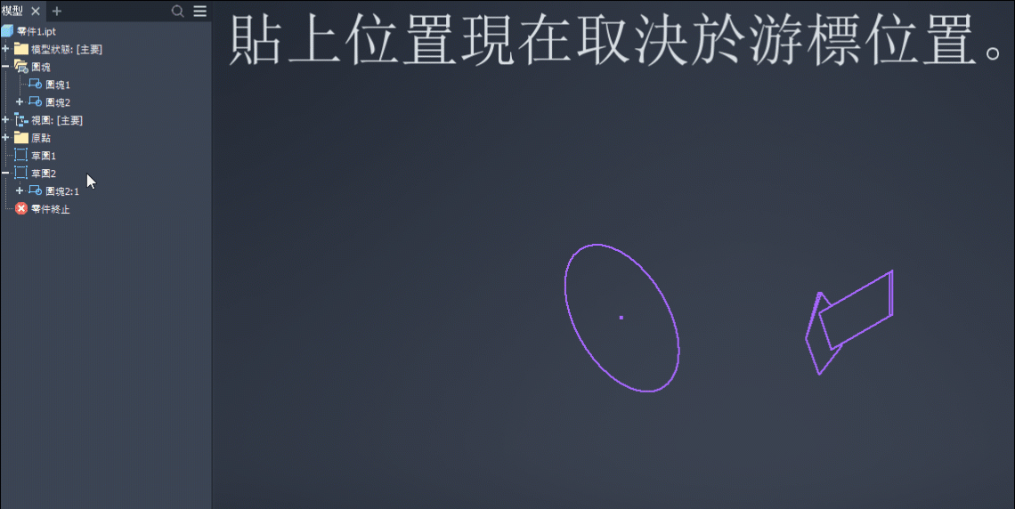 複製並貼上草圖幾何圖形和草圖圖塊時,貼上位置與游標位置相對應。選集的中心將放置在游標位置。