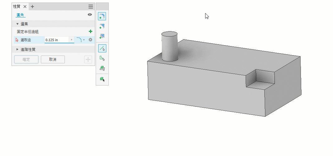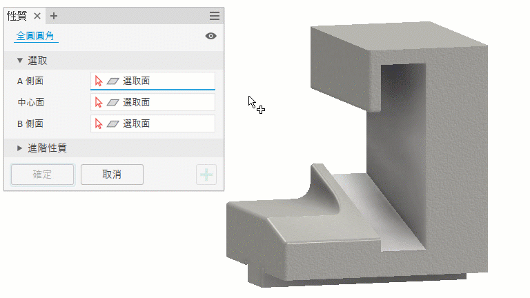 圓角指令已移至「性質」面板架構,並分為三個指令:「圓角」、「面圓角」、「全圓圓角」。舊式圓角已移轉至適當的類型。在移轉過程中,舊式圓角名稱不會修改。