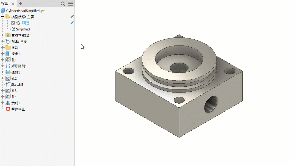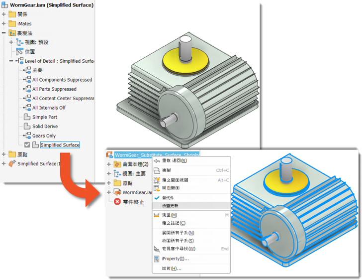 此版本加入了一個功能強大的新工作流程,稱為「模型狀態」。模型狀態可讓您在同一零件檔或組合檔中建立製造狀態、簡化層級等項目。