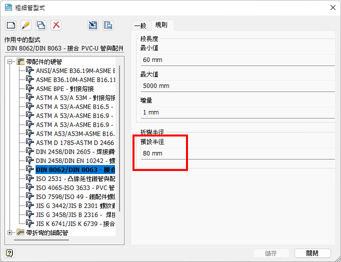 在「粗細管型式」對話方塊中,「預設半徑」編輯欄位現在適用於所有粗細管型式。預設折彎半徑等於 2* 標稱直徑值。變更的值將用於新自訂折彎。將更新具有自訂折彎的既有佈線,以反映新折彎半徑值。