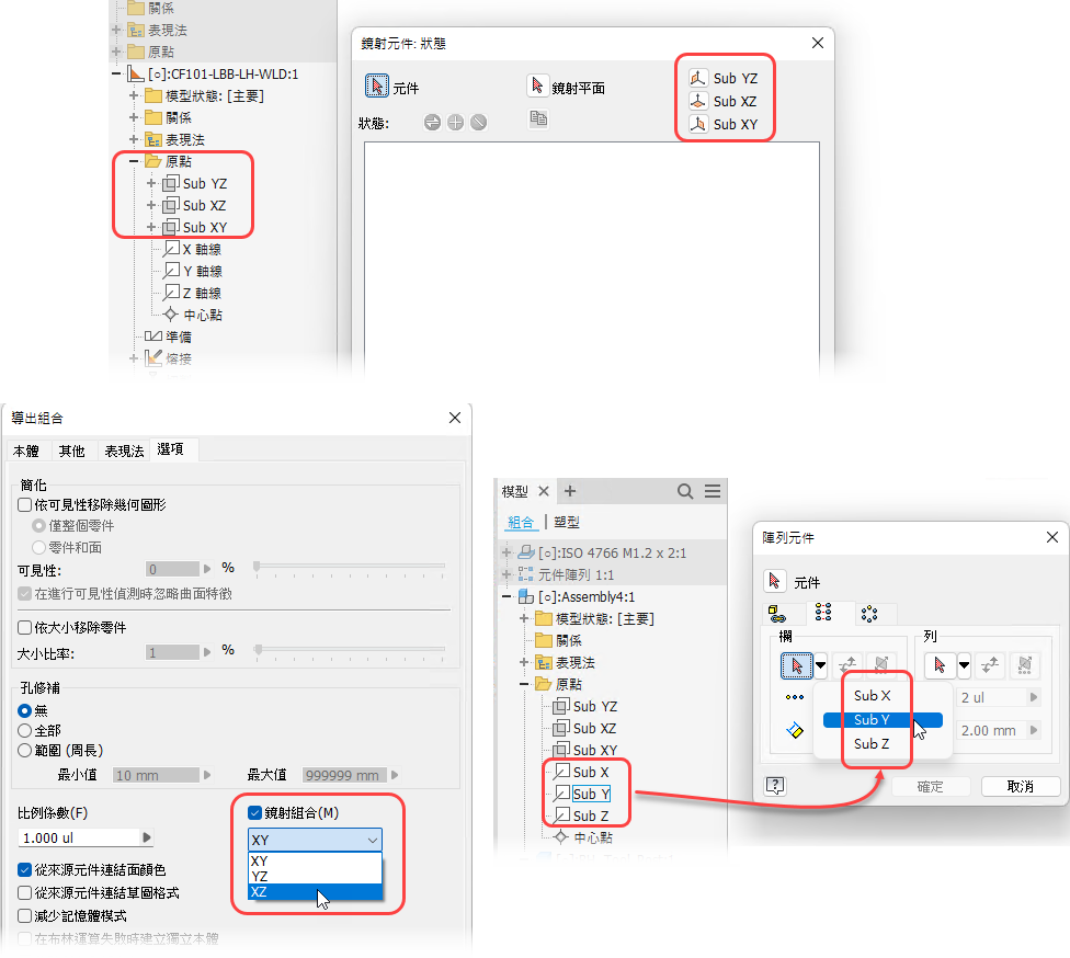 現在,可識別指定給原點工作特徵的自訂名稱,並填入用於如下指令的多個對話方塊:「鏡射元件」、「陣列元件」和「導出組合」。