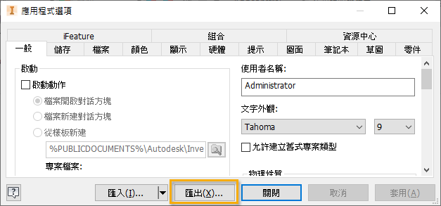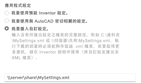 | 在「應用程式選項」對話方塊中,按一下「匯出」。「匯出」會將目前的「應用程式選項」和「iLogic 規劃」對話方塊中的設定儲存至一個 .xml 檔案。 | 建立部署時,請選取「我要匯入自訂設定」,然後輸入所匯出 .xml 檔案的路徑。 |