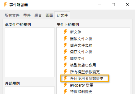 「事件觸發器」對話方塊中現在提供一個稱為「任何使用者參數變更」的新事件。在您變更使用者參數的值時,此事件會觸發。