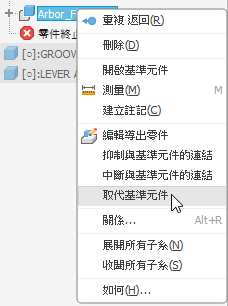 現在,您可以使用「取代基準元件」,在父系組合中取代導出零件或組合的基準元件。