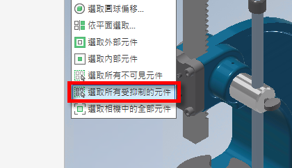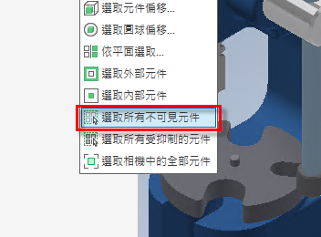 現在,您可以選取組合中所有設定為「不可見」的零件,因此不必手動選取組合或瀏覽器中的每個個別零件。使用「選取」下拉式清單中新加入的「所有不可見元件」選項,或快速存取工具列中的「選取所有不可見元件」,或在按住 Shift 鍵的同時按一下右鍵。