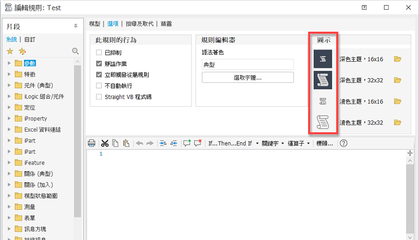 在規則編輯器 (用於外部規則) 的「選項」頁籤中,會顯示目前圖示。按一下資料夾按鈕將開啟檔案對話方塊,您可以在其中選取任何資料夾中的其他點陣圖檔案。您選取的檔案將被複製到與規則相同的資料夾,且名稱已按照命名慣例變更。建議的影像解析度 (以像素為單位) 為 16x16 (小) 和 32x32 (大)。但是,其他大小將自動調整比例。