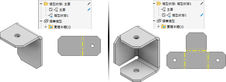 板金零件也可受益於模型狀態。現在,使用模型狀態,您可以建立具有獨特摺疊特徵和展開圖的規劃。