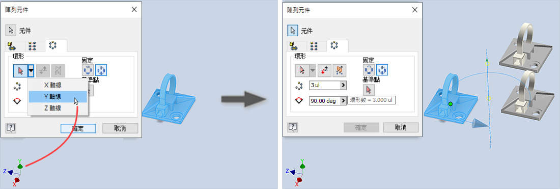 若要取得更多資訊,請參閱〈建立元件的矩形陣列〉和〈建立元件的環形陣列〉。