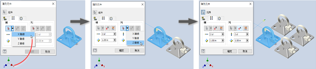 為了使用原點軸線加速建立陣列,「陣列」對話方塊中現在提供這些軸線。按一下選取器即可存取軸線圖示列。